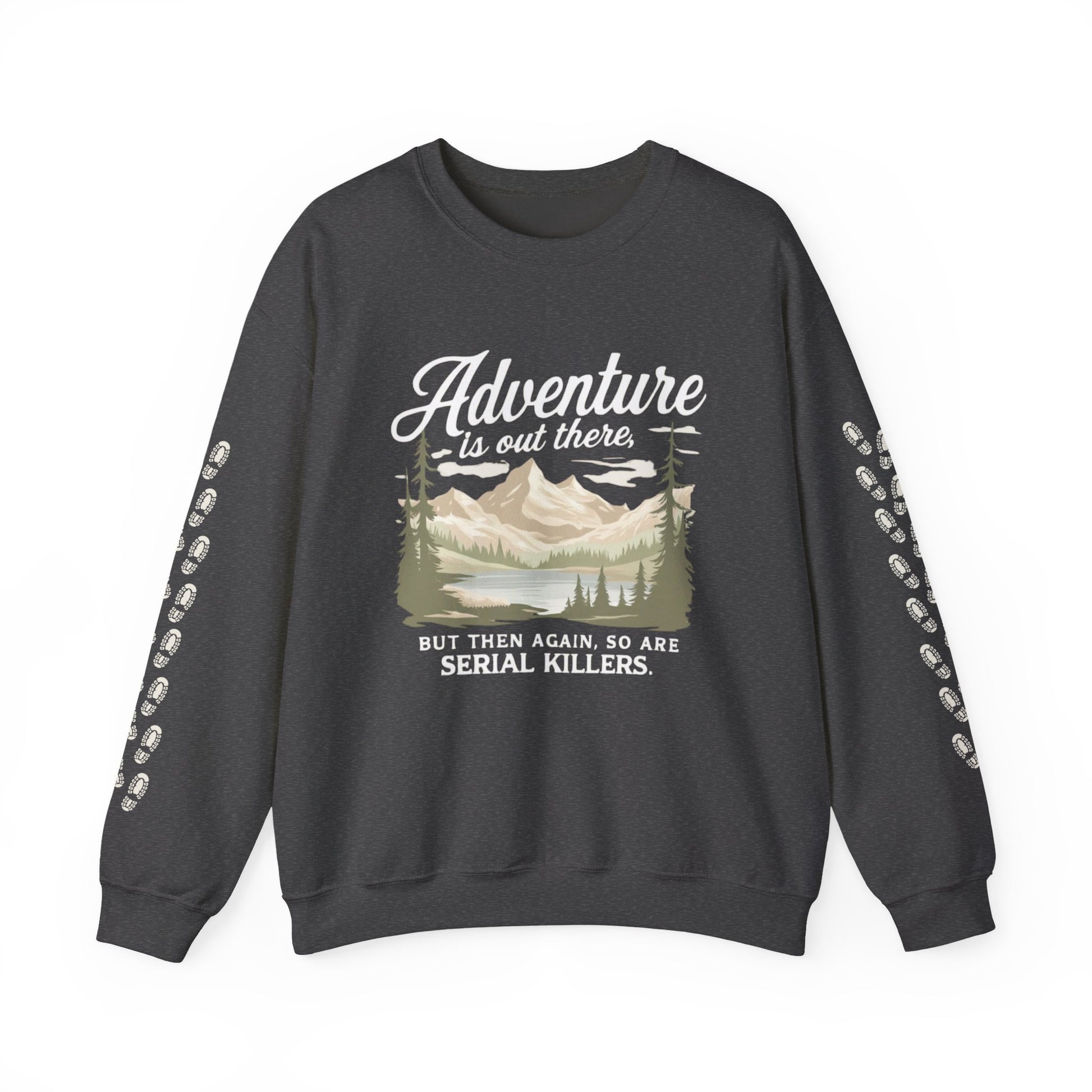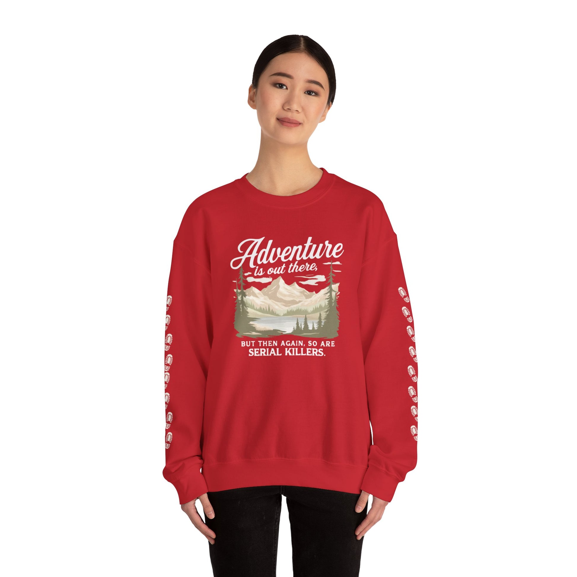 NEW Crewneck Sweatshirt — “Adventure Is Out There… But Then Again, So Are Serial Killers” Fun Graphic Pullover