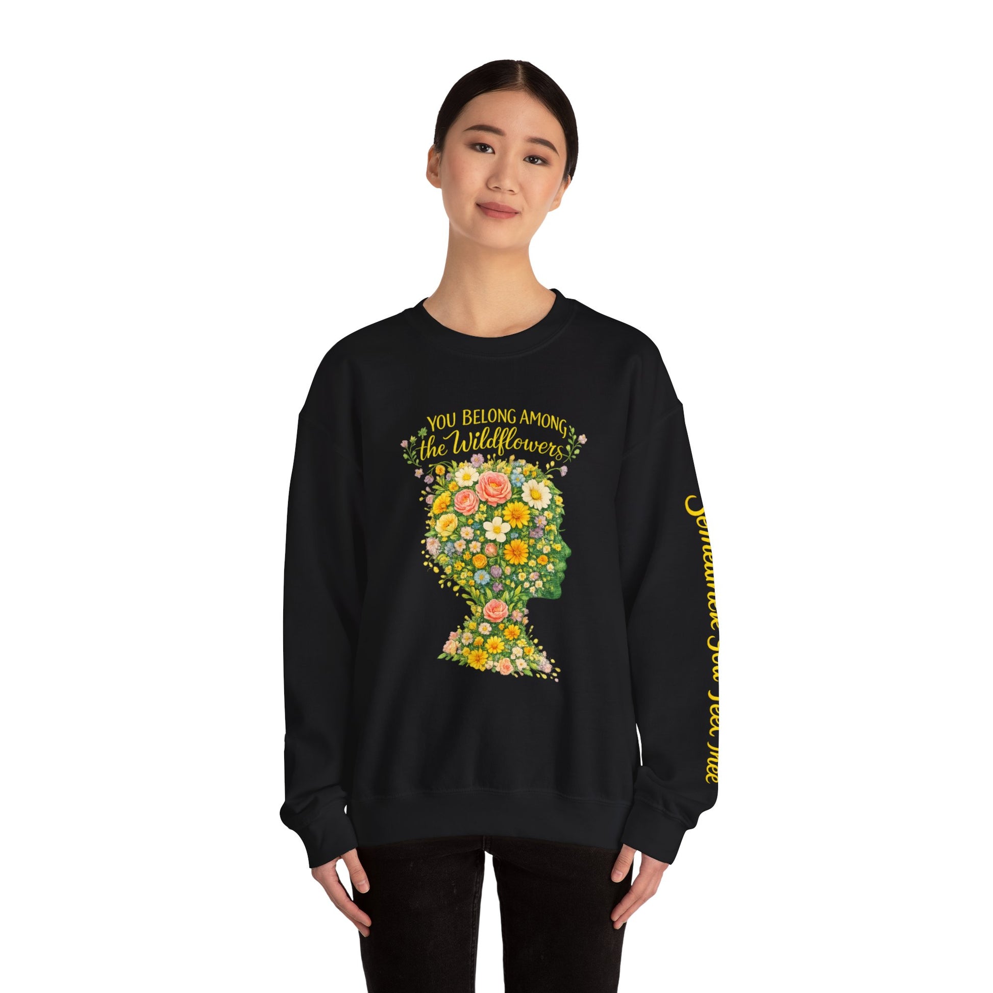 This cozy crewneck carries a quiet, contemplative energy. Floral art forms a profile silhouette at the chest, petals and leaves spilling into soft greens and warm blooms. A subtle script runs along the sleeve, like a whispered reminder you can wear — gentle, introspective, and layered with meaning. The medium-heavy cotton-poly blend gives it weight without stiffness; ribbed collar and reinforced seams keep the shape wash after wash. It settles in like a familiar spot on the couch or a slow walk through a neighborhood garden, accompanying reflective mornings and slow-paced afternoons.