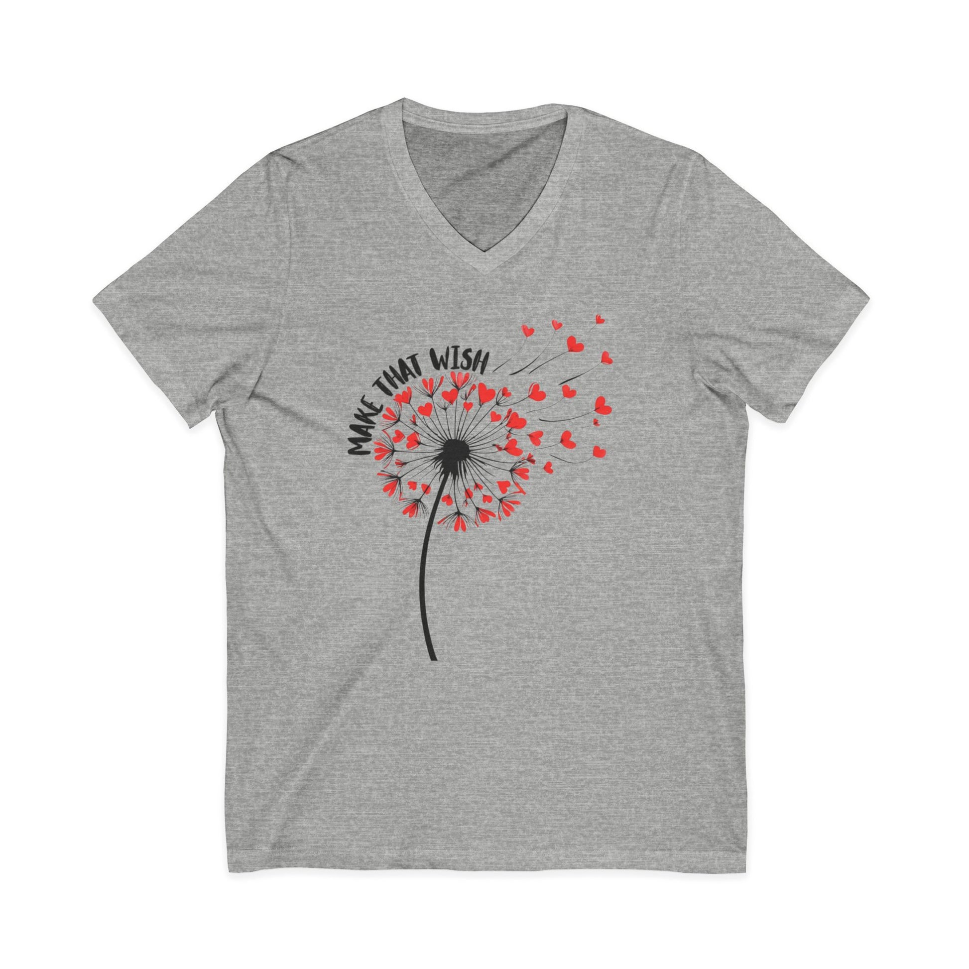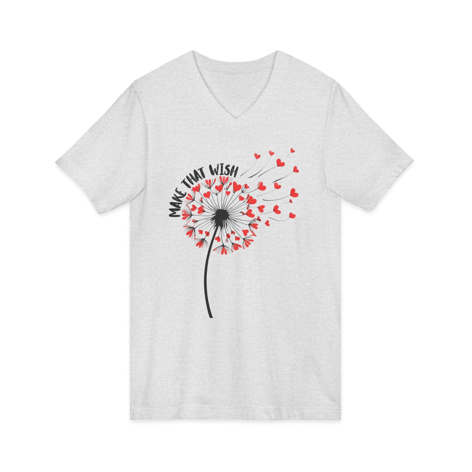 Light and airy, this V-neck tee carries a gentle moment: a dandelion blowing its seeds, each one becoming a tiny heart that drifts away with the words “Make That Wish.” It feels like a quiet afternoon of small hopes—soft cotton against skin, a relaxed retail fit that drapes without clinging, and a neckline that opens the collarbone for an easy, casual look. Wear it on a slow weekend walk, bring it to a cozy gathering, or slip it on when you need a little reminder to breathe and hope. The subtle graphic reads like a personal note, not loud but unmistakable—sincere, whimsical, quietly optimistic.